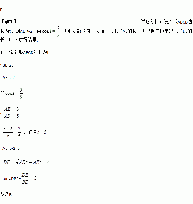 如图,在菱形ABCD中,DE⊥AB,cos A=,BE=2,则tan ∠DBE的值是( )