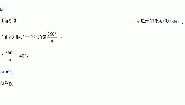 如果正n边形的一个外角是40°,则n的值为( )