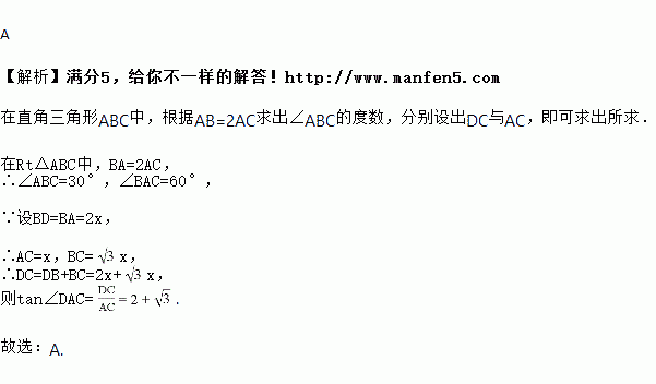 (题文)如图,在Rt△ABC中,∠C=90°,点B在CD上,且BD=BA=2AC,则tan∠DAC的值为( )