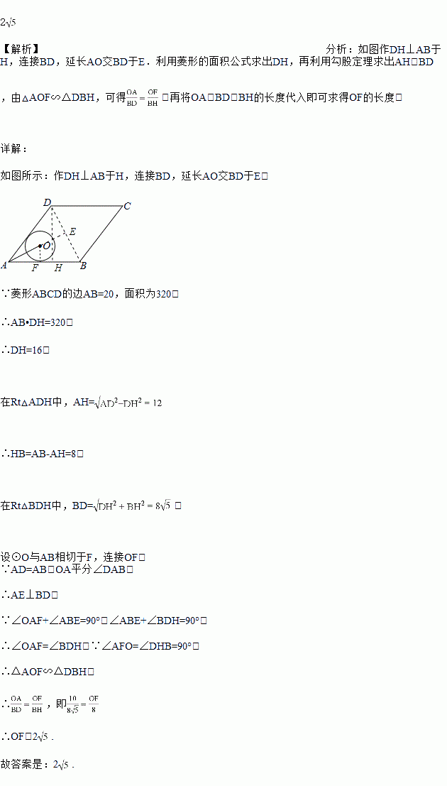 如图,菱形ABCD的边AB=20,面积为320,∠BAD<90°,⊙O与边AB,AD都相切,若AO=10,则⊙O的半径长为_______.