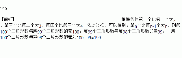 199 【解析】根据条件第二个比第一个大2,第三个比第二个大3,第四个比第三个大4,依此类推,可以得到:第n个比第n-1个大n.则第100个三角形数与第99个三角形数的差100,第99个三角形数与第98个三角形数的差99,∴第100个三角形数与第98个三角形数的差为100+99=199.
