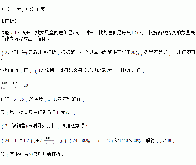 (2)第二批钢笔按24元/支的价格销售,销售一定数量后,根据市场情况,商店决定对剩余的钢笔全按8折一次性打折销售,但要求第二批钢笔的利润率不低于20%,问至少销售多少支后开始打折?