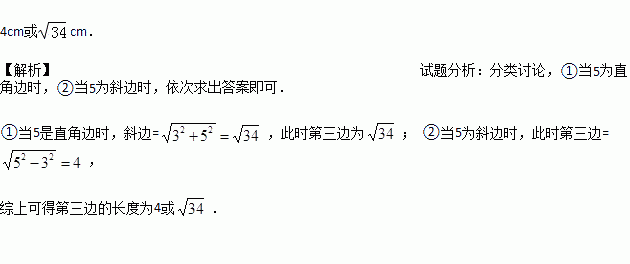 已知直角三角形的两条边长分别是3cm和5cm,那么第三边长是 .