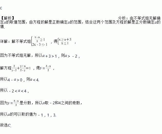 若关于x的不等式组无解,且关于y的方程的解为正分数,则符合题意的整数a有( )个