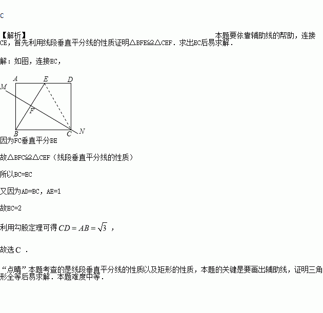 如图,矩形纸片中,点是的中点,且, 的垂直平分线恰好过点,则矩形的一边的长度为( ).