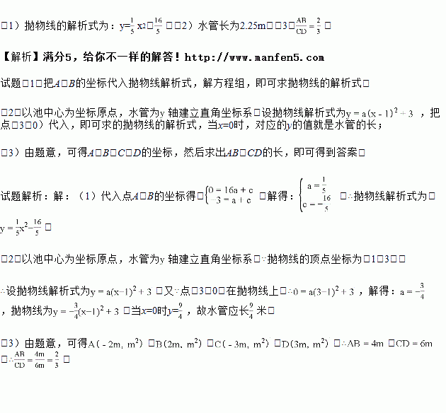 (2)如图1,要修建一个圆形喷水池,在池中心竖直安装一根水管,在水管的顶端安一个喷水头,使喷出的抛物线形水柱在与池中心的水平距离为1m处达到最高,高度为3m,水柱落地处离池中心3m,水管应多长?