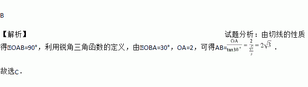 如图,直线AB与⊙O相切于点A,⊙O的半径为2,若∠OBA=30°,则OB的长为( )