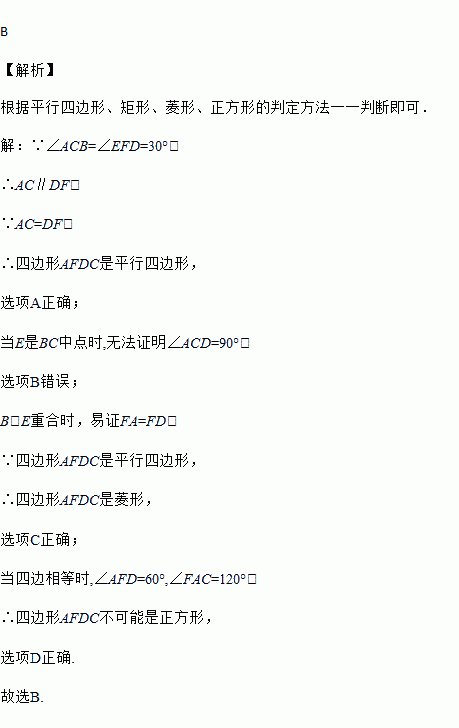 C. 当点B与点E重合时,四边形ACDF是菱形