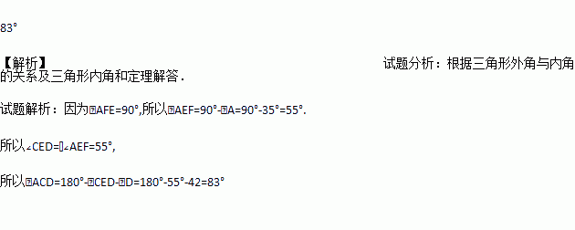 如图,已知D为△ABC边BC延长线上一点,DF⊥AB于F交AC于E,∠A=35°,∠D=42°,求∠ACD的度数.