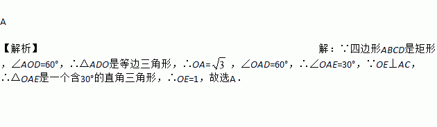 A 【解析】【解析】 ∵四边形ABCD是矩形,∠AOD=60°,∴△ADO是等边三角形,∴OA=,∠OAD=60°,∴∠OAE=30°,∵OE⊥AC,∴△OAE是一个含30°的直角三角形,∴OE=1,故选A.