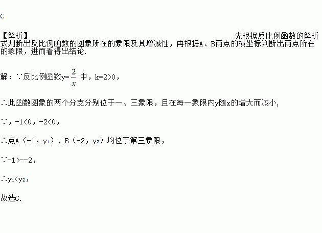 C 【解析】先根据反比例函数的解析式判断出反比例函数的图象所在的象限及其增减性,再根据A、B两点的横坐标判断出两点所在的象限,进而看得出结论. 【解析】 ∵反比例函数y=中,k=2>0, ∴此函数图象的两个分支分别位于一、三象限,且在每一象限内y随x的增大而减小, ∵,-1<0,-2<0, ∴点A(-1,y1)、B(-2,y2)均位于第三象限, ∵-1>--2...