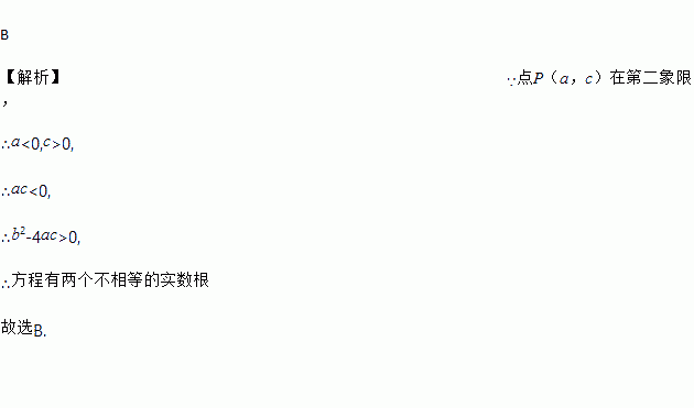 B 【解析】∵点P(a,c)在第二象限, ∴a<0,c>0, ∴ac<0, ∴b2-4ac>0, ∴方程有两个不相等的实数根 故选B.