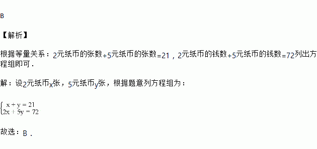 有2元和5元两种纸币共21张,并且总钱数为72元,设2元纸币x张,5元纸币y张,根据题意列方程组为( )