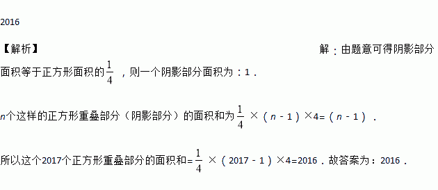 将2017个边长为2的正方形,按照如图所示方式摆放,O1 , O2 , O3 , O4 , O5 , …是正方形对角线的交点,那么阴影部分面积之和等于________.