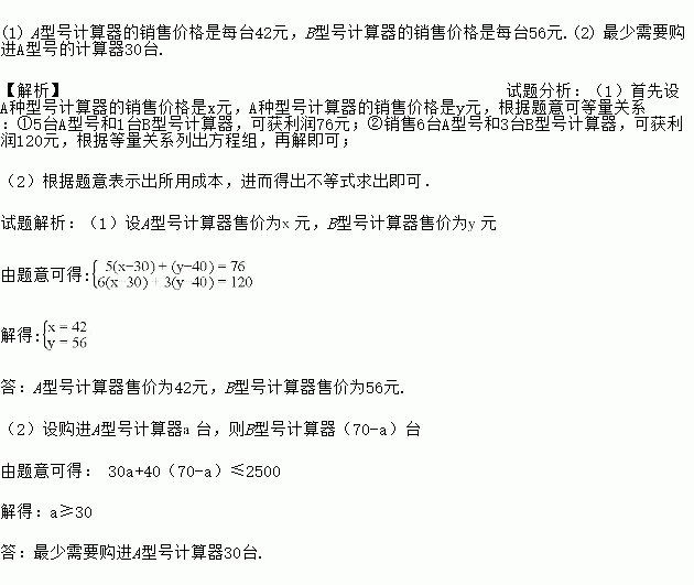 (2)商场准备用不多于2500元的资金购进A、B两种型号计算器共70台,问最少需要购进A型号的计算器多少台?