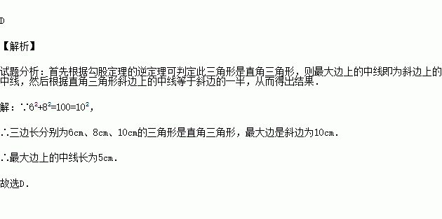 (2015秋•常州期末)若一个三角形的三边长分别为6、8、10,则这个三角形最长边上的中线长为( )