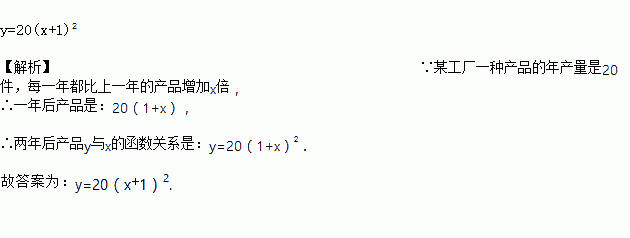 某工厂有一种产品现在的年产量是20万件,计划今后两年增加产量,如果每年都比上一年的产量增加x倍,那么两年后这种产品的产量y将随计划所定的x的值而确定,那么y与x之间的关系应表示为_____.