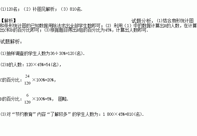 (3)若该中学共有1 800名学生,请你估计这所中学的所有学生中,对“节约教育”内容“了解较多”的有多少名?