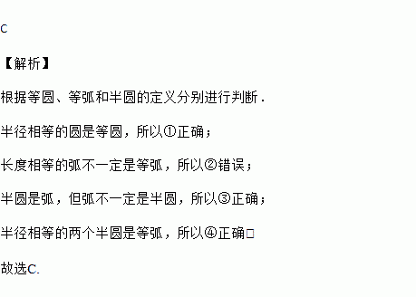 给出下列说法:①半径相等的圆是等圆;②长度相等的弧是等弧;③半圆是弧,但弧不一定是半圆;④半径相等的两个半圆是等弧,其中正确的有( )