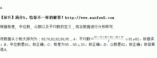 在一次数学测试中,某学习小组6名同学的成绩(单位:分)分别为65,82,86,82,76,95.关于这组数据,下列说法错误的是( )