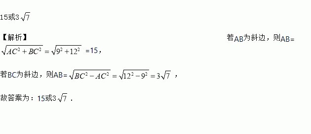 在Rt△ABC中,AC=9,BC=12,则AB=________.