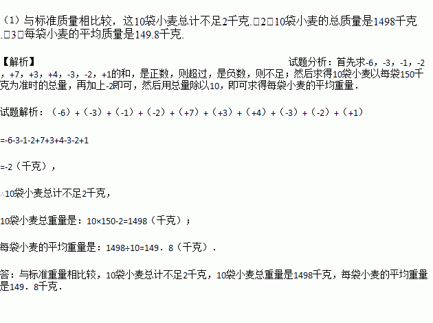 10袋小麦以每袋150千克为标准,超过的千克数记为正数,不足的千克数记为负数,分别记为:-6,-3,-1,-2,+7,+3,+4,-3,-2,+1.