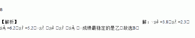 甲、乙、丙、丁四位同学在三次数学测验中,他们成绩的平均分是x甲=85,x乙=85,x丙=85,x丁=85,方差是s甲2=3.8,s乙2=2.3,s丙2=6.2,s丁2=5.2,则成绩最稳定的是( )