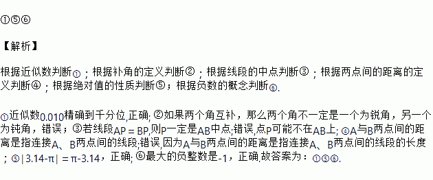 下列语句:①近似数0.010精确到千分位;②如果两个角互补,那么两个角一定是一个为锐角,另一个为钝角;③若线段AP=BP,则P一定是AB中点;④A与B两点间的距离是指连接A、B两点间的线段;⑤││=![]()