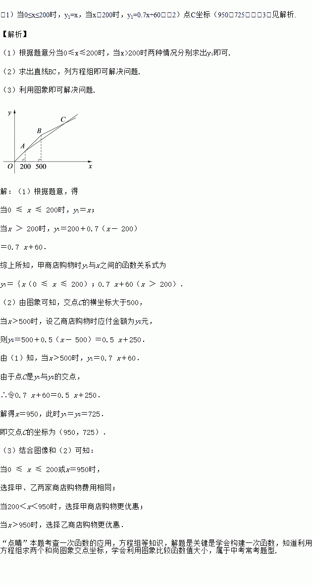 “五一”期间,甲、乙两家商店以同样价格销售相同的商品,两家优惠方案分别为:甲店一次性购物中超过200元后的价格部分打七折;乙店一次性购物中超过500元后的价格部分打五折,设商品原价为x元(x≥0),购物应付金额为y元.