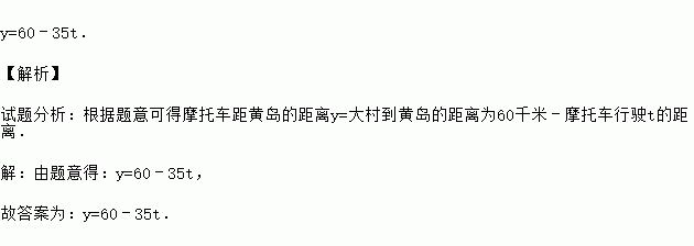 从大村到黄岛的距离为60千米,一辆摩托车以平均每小时35千米的速度从大村出发到黄岛,则摩托车距黄岛的距离y(千米)与行驶时间t(时)的函数表达式为 .