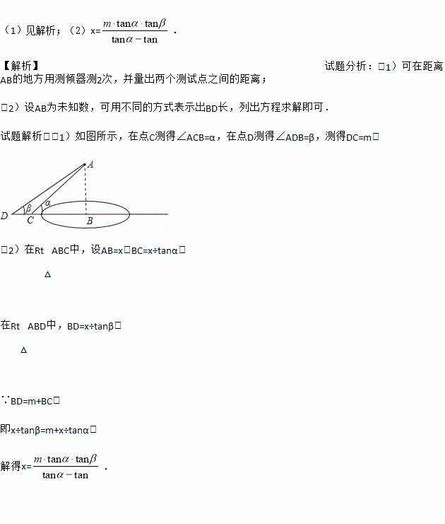 (1)请你根据现有条件,设计一个测量凉亭顶端到湖面所在平面的高度AB的方案,画出测量方案的平面示意图,并将测量的数据标注在图形上(所测的距离用m,n,…表示,角用α,β,…表示,测倾器高度忽略不计);