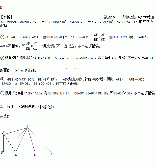 如图,在Rt△ABC中,AB=AC,D、E是斜边BC上两点,且∠DAE=45°,将△ADC绕点A顺时针旋转90°后,得到△AFB,连接EF,下列结论:①△AED≌△AEF;②AE:BE=AD:CD;③△ABC的面积等于四边形AFBD的面积;④BE2+DC2=DE2⑤BE+DC=DE其中正确的是( )
