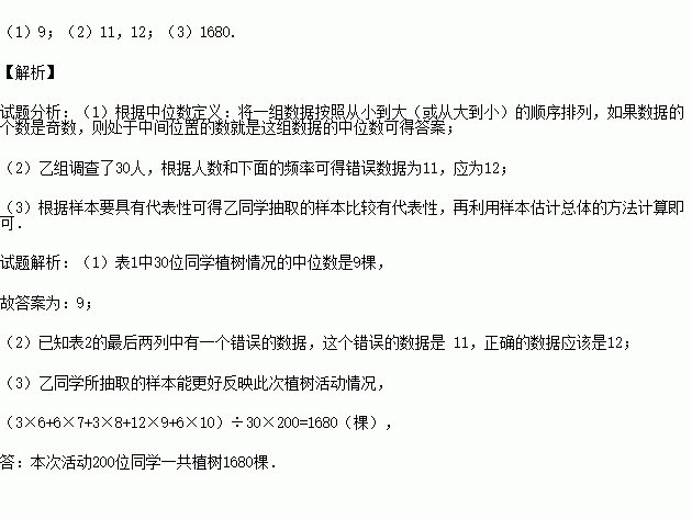 (1)表1中30位同学植树情况的中位数是 9 棵;