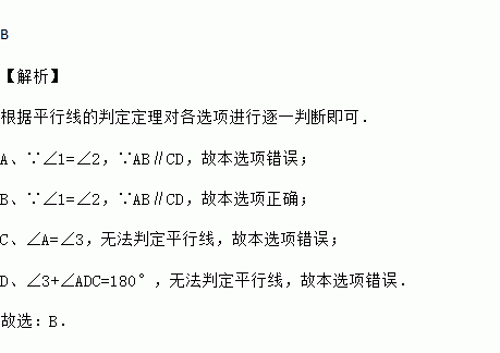 C. 若∠A=∠3,则 AD∥BC D. 若∠A+∠ADC=180°,则AD∥BC