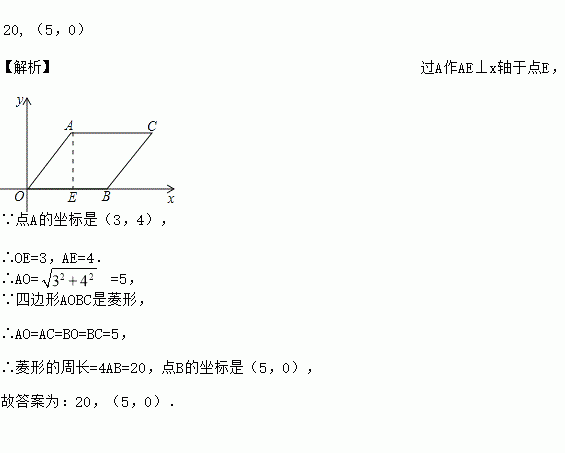 如图,在平面直角坐标系中,四边形AOBC是菱形.若点A的坐标是(3,4),则菱形的周长为____________,点B的坐标是____________.