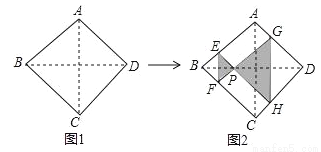 如图,正方形纸片ABCD的边长为2,翻折∠B、∠D,使两个直角的顶点重合于对角线BD上一点P、EF、GH分别是折痕(如图2).设BE=x(0<x<2),阴影部分面积为y,则y与x之间的函数图象为( )