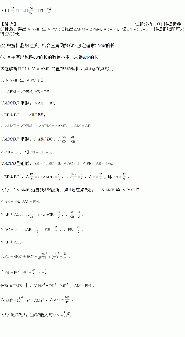 已知:矩形ABCD中,AB=4,BC=3,点M、N分别在边AB、CD上,直线MN交矩形对角线 AC于点E,将△AME沿直线MN翻折,点A落在点P处,且点P在射线CB上.
