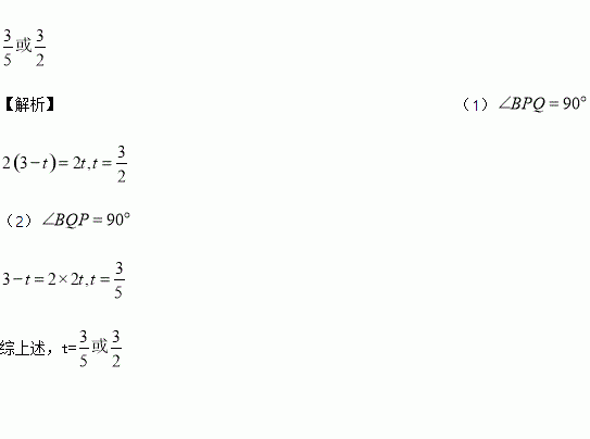 如图,△ABC是边长3cm的等边三角形,动点P、Q同时从A、B两点出发,分别沿AB、BC方向匀速移动,点P的速度都是1cm/s,点Q的速度都是2cm/s当点P到达点B时,P、Q两点停止。当t=______________时,△PBQ是直角三角形.