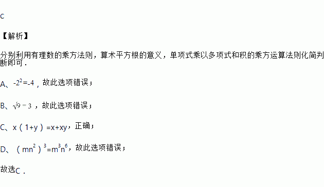 A. -22 =4 B. =±3 C. x(1+y)=x+xy D. (mn2)3=mn6
