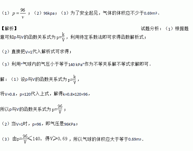 (3)当气球内的气压大于140kPa时,气球将爆炸,为了安全起见,气体的体积应不小于多少?(精确到0.01m3)