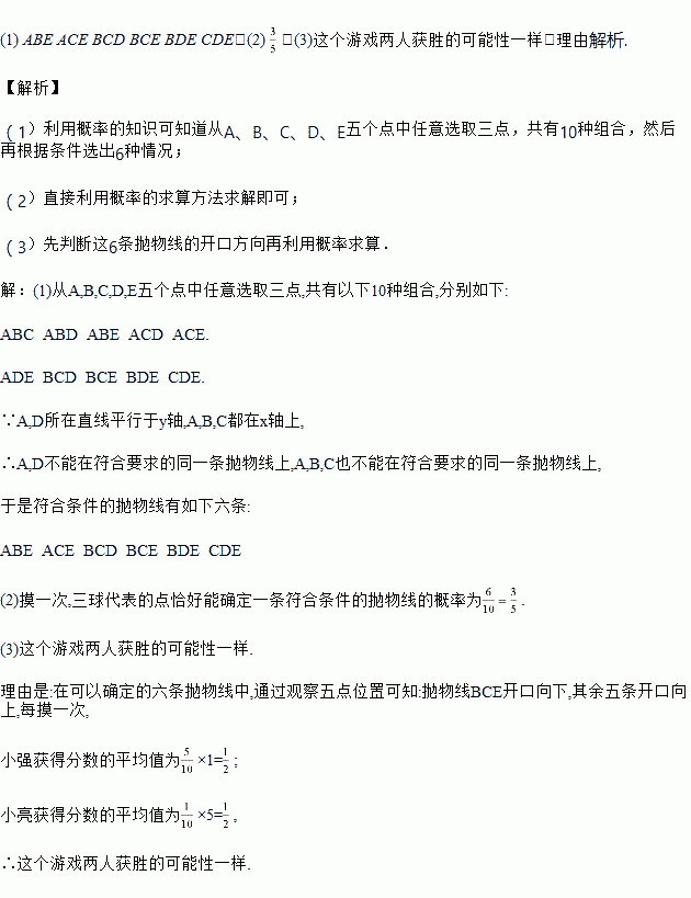 (2)在五个形状、颜色、质量完全相同的乒乓球上标上A,B,C,D,E代表以上五个点,玩摸球游戏,每次摸三个球.请问:摸一次,三球代表的点恰好能确定一条符合条件的抛物线的概率是多少?