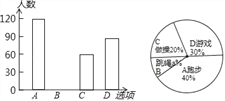 某校在一次大课间活动中,采用了四种活动形式:A、跑步,B、跳绳,C、做操,D、游戏.全校学生都选择了一种形式参与活动,小杰对同学们选用的活动形式进行了随机抽样调查,根据调查统计结果,绘制了不完整的统计图.