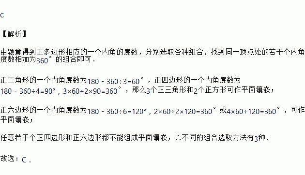 某商场营业厅准备装修地面,现有正三角形,正方形,正六边形这三种规格的花岗石板料(所有边长相等)若从其中选择两种不同的板料铺设地面,则不同的方案有( )