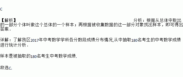 为了了解我市2017年中考数学学科各分数段成绩分布情况,从中抽取180名考生的中考数学成绩进行统计分析.在这个问题中,样本是指( )