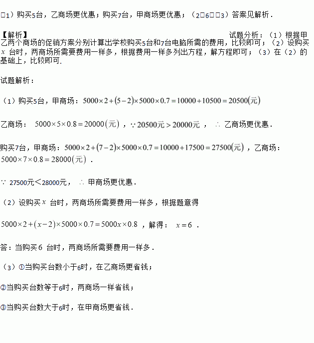 (1)购买5台,乙商场更优惠;购买7台,甲商场更优惠;(2)6;(3)答案见解析. 【解析】试题分析:(1)根据甲乙两个商场的促销方案分别计算出学校购买5台和7台电脑所需的费用,比较即可;(2)设购买台时,两商场所需要费用一样多,根据费用一样多列出方程,解方程即可;(3)在(2)的基础上,比较即可. 试题解析: (1)购买5台,甲商场: 乙商场: ,, 乙商场更优惠. ...