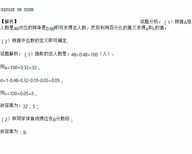 (1)32, 5; (2)B 【解析】试题分析:(1)根据A组人数是48对应的频率是0.48即可求得总人数,然后利用百分比的意义求得a和c的值; (2)根据中位数的定义即可确定. 试题解析:(1)抽取的总人数是:48÷0.48=100(人), 则a=100×0.32=32, d=1-0.48-0.32-0.10-0.05=0.05, 则c=100×0.05=5,...