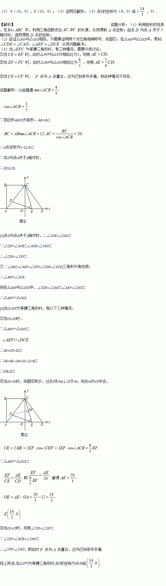 如图,在平面直角坐标系中,点A,C分别在x轴,y轴上,四边形ABCO为矩形,AB=16,AC=20,点D与点A关于y轴对称,点E、F分别是线段AD、AC上的动点(点E不与点A、D重合),且∠CEF=∠ACB.