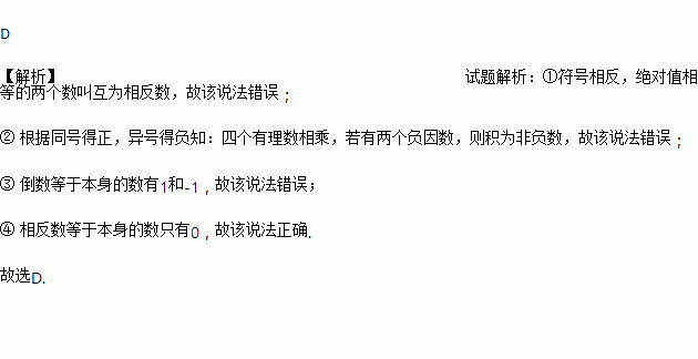 ① 符号相反的数叫相反数;② 四个有理数相乘,若有两个负因数,则积为正;③ 倒数等于本身的数只有1;④ 相反数等于本身的数只有0;