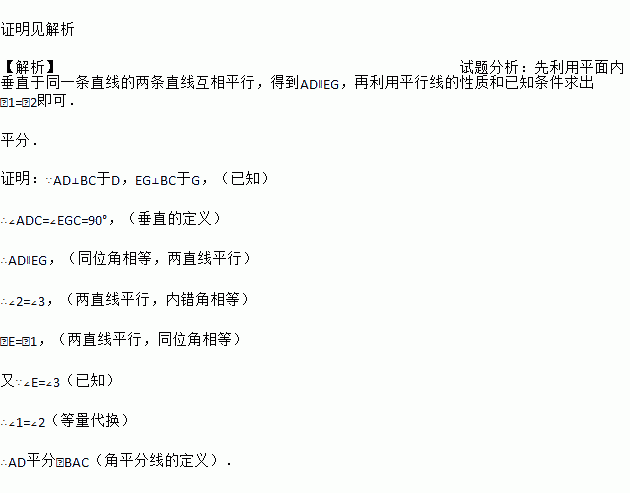 如图,AD⊥BC于点D,EG⊥BC于点G,∠E=∠3.请问:AD平分∠BAC吗?若平分,请说明理由.