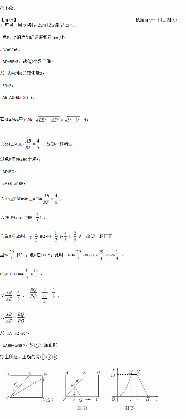 如图(1),E为矩形ABCD的边AD上一点,动点P、Q同时从点B出发,点P沿折线BE-ED-DC运动到点C时停止,点Q沿BC运动到点C时停止,运动的速度都是1cm/秒.设P、Q同发t秒时,△BPQ的面积为ycm2.已知y与t的函数关系图象如图(2)(曲线OM为抛物线的一部分),则下列结论:①AD=BE=5;②cos∠ABE=